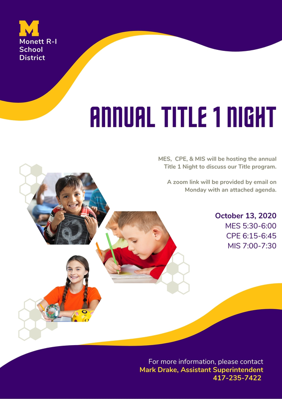 MES, CPE, & MIS will be hosting the annual Title 1 Night to discuss the Title program and parent involvement through a Zoom meeting. A Zoom link will be provided by email on Monday, October 13, with an attached agenda.
